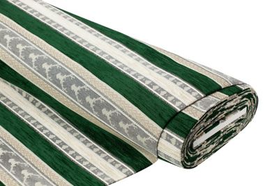 Möbelstoff "Hirsch", Farbe: grün-color, Streifenbreite grün: 4,5 cm, Scheuerbeständigkeit: 20.000 Touren, Lichtechtheit: 5-6, quer gestreift, Rapport: 26 cm, Breite: 140 cm, Gewicht: ca. 300 g/m². Material: 60 % Polyacryl, 40 % Polyester.