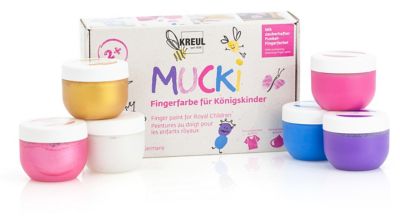 Mucki Fingerfarben für Königskinder, in den Farben Weiß, Feenstaub-Rosa, Pink, Violett, Blau und Goldschatz, Inhalt: 6x 50ml.