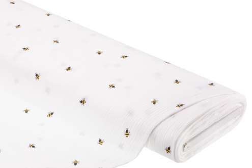 Musselin/Doppel-Gaze "Biene“, Farbe: weiß/gelb, Motivgröße: 1,5 x 1,5 cm, Breite: 130 cm, Gewicht: ca. 120 g/m². Material: 100 % Baumwolle.