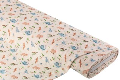 Musselin – auch Doppel-Gaze, Baumwollkrepp oder Mull genannt – ist ein lockeres Baumwollgewebe, dessen zwei Stofflagen punktuell miteinander verbunden sind. Dadurch bekommt der Stoff nicht nur die typische Crinkle-Struktur, sondern wird auch weitgehend blickdicht. Highlight dieses Musselins sind die süßen Dinos, die auf Stramplern und Pumphosen, auf Babydecken oder Betthimmeln perfekt zur Geltung kommen. Auch locker fallende Vorhänge, Deko und Accessoires lassen sich aus Doppel-Gaze zaubern. Jetzt bestellen und aufs Nähen freuen!