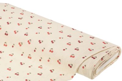 Musselin/Doppel-Gaze "Kirschen", Farbe: creme-color, Motivgröße Kirsche doppelt: 2 cm Ø, Breite: 135 cm, Gewicht: ca. 125 g/m². Material: 100 % Baumwolle.
