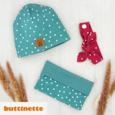 Nähanleitung "Set: Beanie, Loop & Haarband", exklusiv von buttinette, je eine Anleitung für eine Kinder-Wendebeanie, einen Kinder-Wendeloop und ein Kinder-Haarband inkl. Schnittmuster, Kopfumfang Beanie: 44–62, Kopfumfang Haarband: 34–52, Größe Wendeloop: für 0–6 Jahre, Schwierigkeitsstufe 2/3, Stoffempfehlung: Jersey, elastische Stoffe.
