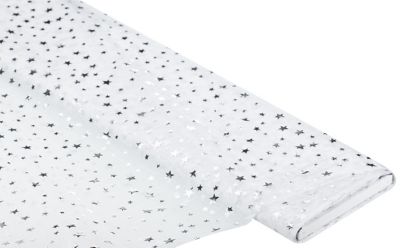 Hauchfeiner Organza "Sterne" mit Foliendruck, transparent, Farbe: weiß, Motivgröße Sterne: 5 – 10 mm Ø, Breite: 145 cm, Gewicht: ca. 25 g/m². Material: 50 % Polyamid, 50 % Polyester.