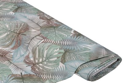 Outdoor-Gewebe "Blätter", Farbe: offwhite/grün, digital bedruckt, Motivgröße grünes Blatt: 14 x 17 cm, wasser- und ölabweisend, Lichtechtheit: 7–8, Pillingfestigkeit: 4, Waschechtheit: 4–5, Scheuerwert: > 45.000 Touren, Beschichtung gegen Pilze und Schimmel, Breite: 140 cm, Gewicht: ca. 290 g/m². Material: 50 % Baumwolle, 50 % Polyester.