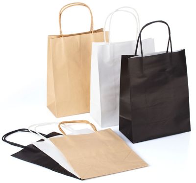 Papiertüten mit Blockboden und Henkel, Farben: braun, schwarz, weiß, Größe: 24,5 x 19 cm, Tiefe: 10 cm, Gewicht: 180 g/m², Inhalt: je Farbe 2 Stück = 6 Stück.