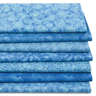 Exklusiv von buttinette: Patchwork- und Quiltpaket "Batik", Farbe: blau-color, aus der Quiltserie "Mona", aus besonders feiner, weicher und hochveredelter Baumwolle (Renforcé), Gewicht: ca. 130 g/m². Paketinhalt: 7 verschiedene Muster, wie abgebildet, jeweils 30 cm lang und 75 cm breit. Material: 100 % Baumwolle.