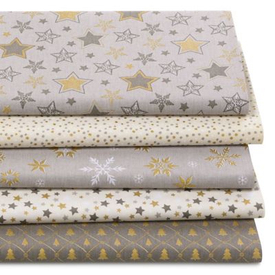 Exklusiv von buttinette: Patchwork- und Quiltpaket "Christmas", Farbe: taupe/gold, mit goldenem Glitzerdruck, aus der Quiltserie "Mona", aus besonders feiner, weicher und hochveredelter Baumwolle (Renforcé), Gewicht: ca. 130 g/m². Paketinhalt: 5 verschiedene Muster, wie abgebildet, jeweils 30 cm lang und 75 cm breit. Material: 100 % Baumwolle.