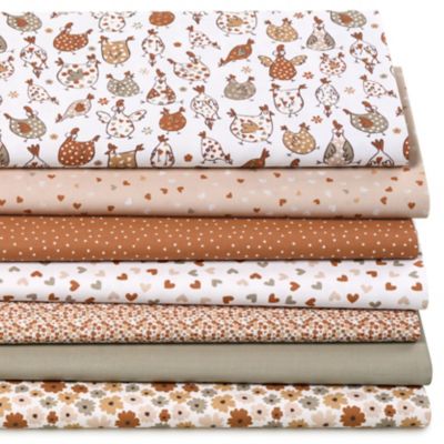 Exklusiv von buttinette: Patchwork- und Quiltpaket "Verrückte Hühner", Farbe: braun-color, aus der Quiltserie "Lena", aus besonders feiner, weicher und hochveredelter Baumwolle (Renforcé), Gewicht: ca. 130 g/m². Paketinhalt: 7 verschiedene Muster, wie abgebildet, jeweils 30 cm lang und 75 cm breit. Material: 100 % Baumwolle.
