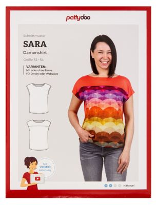 pattydoo Schnitt "Damenshirt Sara", Anleitung für Shirt mit oder ohne Passe, Größe 32–54, Schwierigkeitsstufe: leicht, Stoffempfehlung: weich fallende, leichte Stoffe (Jersey oder Webware).
