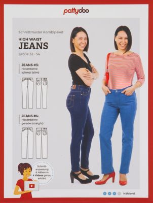 pattydoo Schnitt "Jeans #3 und Jeans #4", Anleitung für 2 Modelle, Größe 32–54, Schwierigkeitsstufe: mittel, Stoffempfehlung: Hosenstoffe mit Elasthan-Anteil, z. B. Stretch-Denim.