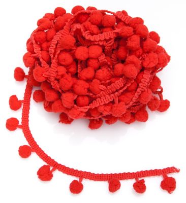 Pompon-Borte, Farbe: rot, Gesamtbreite: 20 mm, Pompon: 10 mm Ø, 5 m pro Rolle. Material: 100 % Polyester.