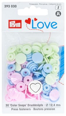 Prym Druckknöpfe "Color Snaps Herz", leichte Schlusskraft, Farben: rosa, grün, hellblau, Größe: 12,4 mm Ø, Inhalt: 30 Stück ohne Verarbeitungswerkzeug. Material: Kunststoff.