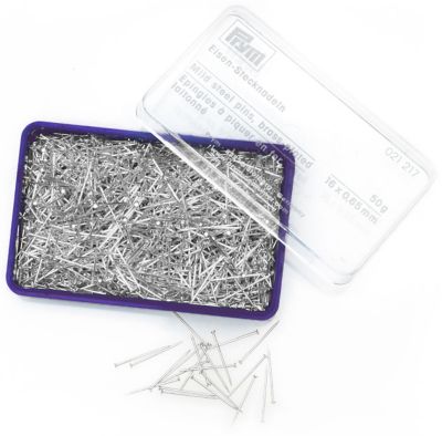 Prym Eisenstecknadeln, Farbe: silber, Länge: 16 mm, Stärke: 0,65 mm, Inhalt: 50 g = ca. 1000 Stück, inkl. Kunststoff-Box. Material: Eisen.