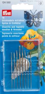 Prym Sticknadeln, mit und ohne Spitze, Stärke: 0,90–1,20 mm, Länge: 4–5 cm, Inhalt: 16 Stück, mit Einfädler und Kunststoffbox. Material: Stahl.