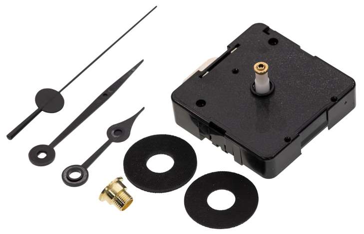 Quarz-Uhrwerk-Set, Inhalt: Uhrwerk mit Uhrenaufhänger, 3 Kunststoffzeiger schwarz, Längen: 5 cm, 7 cm und 9,8 cm. Geeignet für Zifferblattstärke 4–7 mm. Es wird noch eine Mignonbatterie AA benötigt (nicht enthalten).