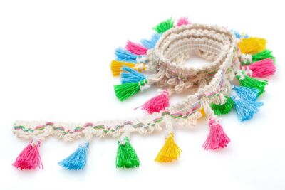 Quastenborte, Farbe Borte: creme, Farbe Quasten: rosa, blau, grün, gelb, Bortenbreite: 10 mm, Gesamtbreite: 45 mm, Quastenlänge: 25 mm, Länge: 2,5 m. Material: 100 % Polyester.