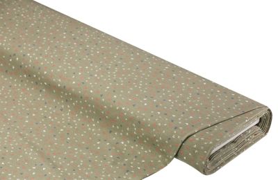 Exklusiv von buttinette: reiner Baumwolljersey "Herzen", Farbe: schilf-color, leicht querelastisch, Motivgröße Herzen: 5 mm Ø, Breite: 160 cm, Gewicht: ca. 220 g/m², Einlaufwerte: 3–5 % in Länge und Breite. Material: 100 % Baumwolle.