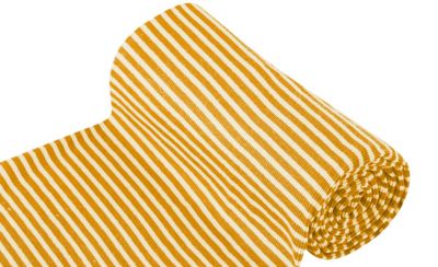 Hochwertiges Ringelbündchen, Farbe: ocker/creme, Schlauchware, elastisch, für Arm- und Beinabschluss uvm., Streifen quer verlaufend, Streifenbreite: 3 - 5 mm, Rippe: 2 mm, Breite: 45 cm im Schlauch (aufgeschnitten 90 cm), Gewicht: ca. 340 g/m². Material: 93 % Baumwolle, 7 % Elasthan.