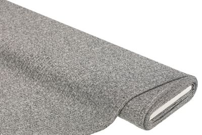 Gerippter Strickstoff, Farbe: grau-meliert, querelastisch, Rippen längs verlaufend, Rippenbreite: 1 cm, Breite: 155 cm, Gewicht: ca. 185 g/m². Material: 100 % Polyester.