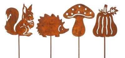 Rost-Herbststecker aus Metall, Farbe: braun, Größen: Igel 10 x 7 cm, Pilz 9,5 x 10 cm, Eichhörnchen 9 x 10 cm, Kürbis: 10 x 8 cm, Stablänge: 20 cm, Inhalt: 4 Stück.