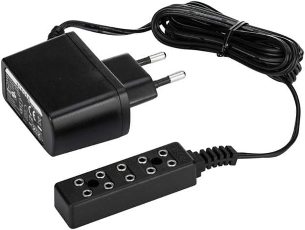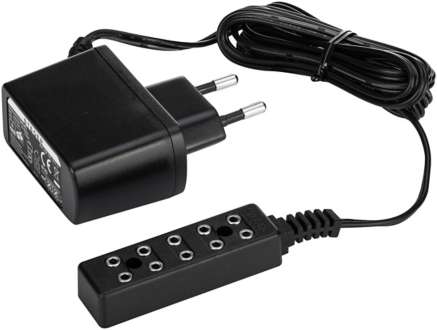 Ruhe-/Flackerlichttrafo mit 5-fach-Verteiler, 3 Steckplätze für Dauerlicht und 2 Steckplätze für Flackerlicht, für Niedervoltstecker 3,5 V. Größe: 6 x 1,8 x 1,3 cm, Zuleitung: 1,55 m, mit Eurostecker.