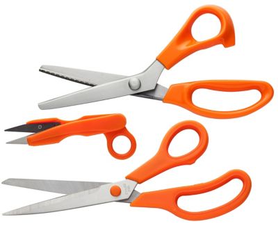 Scheren-Set mit Schneiderschere (aus Edelstahl, Länge: 24,5 cm), Zackenschere (aus Stahl, Länge: 23,5 cm) und Fadenschere (aus Edelstahl, Länge: 13 cm), Farbe: orange.