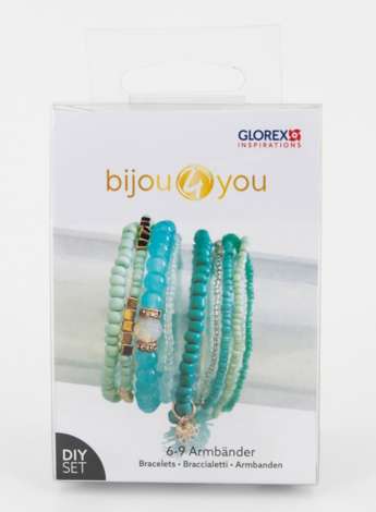 Schmuck-Set Armbänder "türkis" zum Basteln von 6–9 Armbändern. Inhalt: Glasperlen, Kunststoffperlen, Quaste, Metallzubehör und ein Nylongummi.