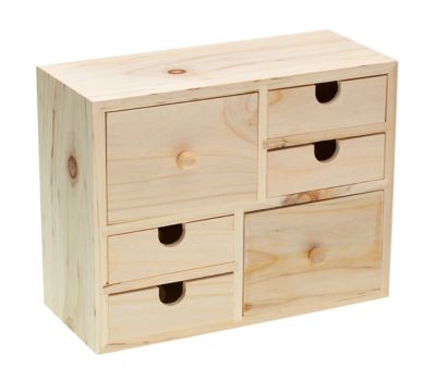Schränkchen aus Holz, mit zwei großen und vier kleinen Schubladen, Farbe: natur, Gesamtgröße: 22 x 9,5 x 17 cm (BxTxH), Größe Schublade groß: 8,5 x 9,5 x 6,5 cm, Größe Schublade klein: 8,5 x 8 x 2,5 cm.