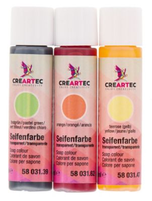 Seifenfarben-Set, Inhalt: 3x 10 ml. Zum Einfärben der geschmolzenen Seifenmasse. Für transparente und weiße Flüssigseife zu verwenden. Farben: grün, gelb, orange.