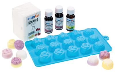 Seifengieß-Set "Blumen", Inhalt: 250 g Seife opak, 1 Silikon-Gießform "Blumen", mit vier verschiedenen Motiven, je 10 ml Seifenfarbe in Flieder, Orange und Gelb, Anleitung. Größe Blumen: 2,5–3 cm Ø. Materialbedarf: 150 g.