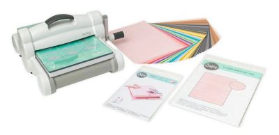 Sizzix Big Shot-Plus Starter-Set, Inhalt: Big Shot-Maschine plus (DIN A4), ein Paar Schneideplatten, eine Plattform, Adapter A, eine Bigz Prägeschablone, 19 Thinlits Schablonen, 20 Kartonbögen uni, Größe: DIN A4, 20 Effekt-Papiere DIN A4 und eine Anleitung.