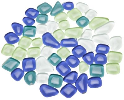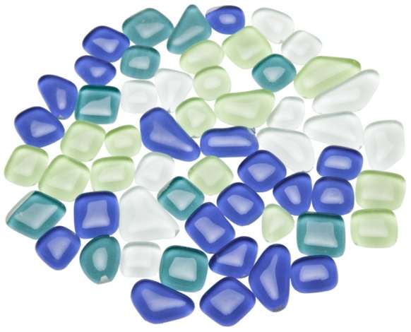 Softglas-Mosaik, frost- und hitzebeständig, unregelmäßige Formen, Farbe: blau, türkis, grün, weiß, Größe: 10 - 20 mm, Stärke: 3 mm, Inhalt: 200 g = ca. 140 Stück.