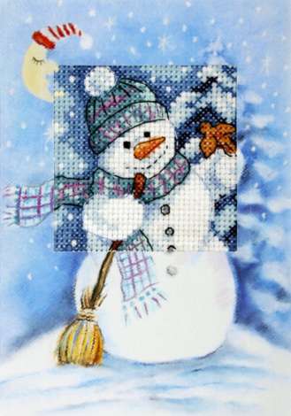 Stick-Grußkarte "Schneemann", zum Besticken nach Zählvorlage in Kreuzstich (ca. 5,4 Stiche/cm). Komplettpackung: Anleitung, Zählvorlage, Aidastück, farbig bedruckte Grußkarte, Kuvert, Sticknadel. Größe: 10,5 x 15 cm. Material: bedrucktes Papier, Aidastoff und Garn 100 % Baumwolle.
