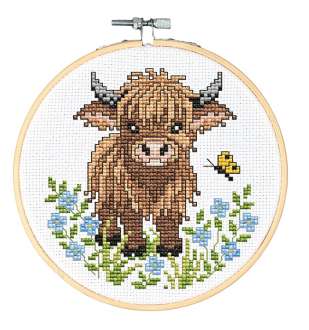 Stickbild "Highland Rind", zum Besticken in Kreuzstich nach Zählvorlage (ca. 5,4 Stiche/cm). Komplettpackung: Anleitung, Zählvorlage, Garn, Sticknadel, Bambusrahmen. Stofffarbe: weiß. Größe: Ø 15 cm. Material: Stoff und Garn 100 % Baumwolle.