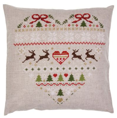 Stickkissen "Landhaus Weihnacht" zum Besticken in Kreuzstich. Vorgedrucktes Motiv, fertig genäht mit Rückseite und Reißverschluss. Ohne Kissenfüllung. Komplettpackung: Anleitung, Garn, Sticknadel. Stofffarbe: leinengrau. Größe: 40 x 40 cm. Material: Stoff 50 % Leinen, 50 % Baumwolle, Garn 100 % Baumwolle.
