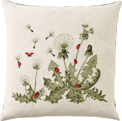 Stickkissen "Löwenzahn & Marienkäfer", zum Besticken in Kreuzstich nach Zählvorlage (ca. 10 Fäden/cm). Ohne Kissenrücken und Kissenfüllung. Komplettpackung: Anleitung, Zählvorlage, Garn, Sticknadel. Stofffarbe: weiß. Größe: 40 x 40 cm. Material: Stoff 100 % Leinen, Garn 100 % Baumwolle.
