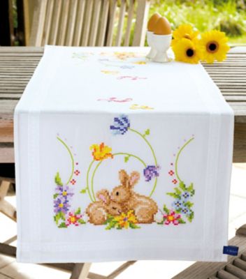 Stickläufer "Frühling mit Häschen", zum Besticken in Kreuz- und Stielstich. Vorgedrucktes Motiv, mit Webrand, randfertig gesäumt. Komplettpackung: Anleitung, Garn, Sticknadel. Stofffarbe: weiß. Größe: 40 x 100 cm, Material: Stoff und Garn 100 % Baumwolle.