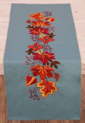 Stickläufer "Herbstlaub", zum Besticken in Ketten-, Stiel-, Platt-, Margeriten-, Knötchen-, Spannstich und Nadelmalerei. Vorgedrucktes Motiv, randfertig gesäumt. Komplettpackung: Anleitung, Garn, Sticknadel. Stofffarbe: grau. Größe: 35 x 95 cm. Material: Stoff 50 % Baumwolle, 50 % Leinen, Garn 100 % Baumwolle.