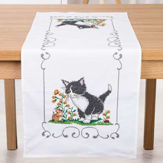 Stickläufer "Katze + Maus", zum Besticken in Kreuzstich. Vorgedrucktes Motiv, randfertig gesäumt. Komplettpackung: Anleitung, Garn, Sticknadel. Stofffarbe: weiß. Größe: 40 x 100 cm. Material: Stoff und Garn 100 % Baumwolle.