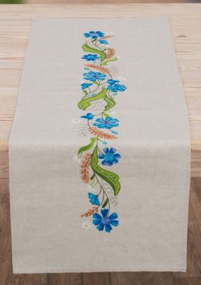 Stickläufer "Kornblumen", zum Besticken in Stiel-, Spann-, Knötchen,- Plattstich und Nadelmalerei. Vorgedrucktes Motiv, randfertig gesäumt. Komplettpackung: Anleitung, Garn, Sticknadel. Stofffarbe: leinen. Größe: 35 x 95 cm. Material: Stoff 50 % Baumwolle, 50 % Leinen, Garn 100 % Baumwolle.