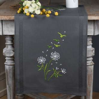 Stickläufer "Pusteblumen + Vögel", zum Besticken in Platt-, Spann- und Stielstich. Vorgedrucktes Motiv, mit Webrand, randfertig gesäumt. Komplettpackung: Anleitung, Garn, Sticknadel. Stofffarbe: dunkelgrau. Größe: 40 x 100 cm. Material: Stoff und Garn 100 % Baumwolle.