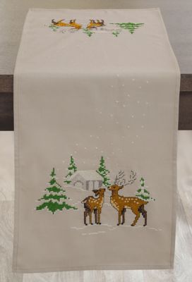 Stickläufer "Rehe in Winterlandschaft", zum Besticken in Kreuzstich. Vorgedrucktes Motiv, randfertig gesäumt. Komplettpackung: Anleitung, Garn, Sticknadel. Stofffarbe: leinen. Größe: 35 x 95 cm. Material: Stoff und Garn 100 % Baumwolle.