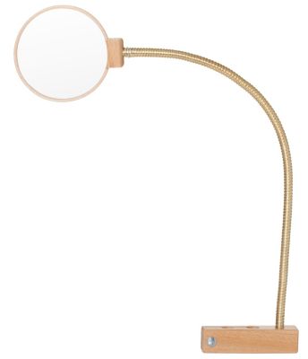 Sticklupe mit Befestigungsvorrichtung für den Stickrahmen B.-Nr. 99.447.73. Der biegsame Schwenkarm aus Messing lässt sich nach Belieben verstellen. Rahmen aus Buchenholz, Lupengröße: 10 cm Ø, 2-fache Vergrößerung.