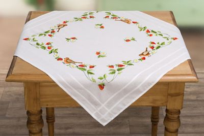 Stickmitteldecke "Erdbeeren & Rotkehlchen", zum Besticken in Platt-, Stiel-, Knötchen-, Stepp-, Spannstich und Nadelmalerei. Vorgedrucktes Motiv, mit Webrand, randfertig gesäumt. Komplettpackung: Anleitung, Garn, Sticknadel. Stofffarbe: weiß. Größe: 80 x 80 cm. Material: Stoff und Garn 100 % Baumwolle.