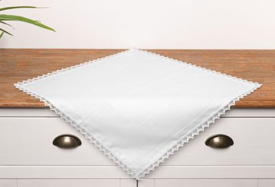 Stickmitteldecke mit Spitze. Fertig genäht, eingefasst mit Spitzenband, umlaufende Aida-Borte mit ca. 7 cm Breite, zum individuellen Besticken (ca. 4 Stiche/cm). Stoffarbe: weiß. Größe: 55 x 55 cm. Material: 100 % Baumwolle.