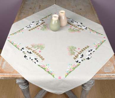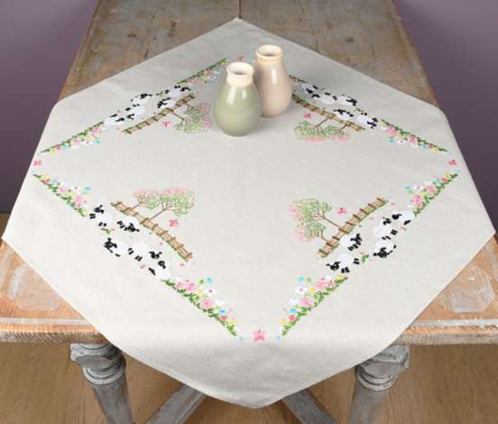 Stickmitteldecke "Schäfchen auf der Weide", zum Besticken in Knötchen-, Schlingen-, Platt-, Spann- und Stielstich. Vorgedrucktes Motiv, randfertig gesäumt. Komplettpackung: Anleitung, Garn, Sticknadel. Stofffarbe: leinen. Größe: 72 x 72 cm. Material: Stoff und Garn 100 % Baumwolle.