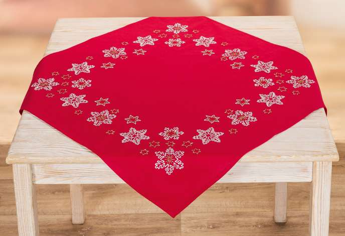 Stickmitteldecke "Sterne rot-gold", zum Besticken in Stiel- und Knötchenstich. Vorgedrucktes Motiv, randfertig gesäumt. Stofffarbe: rot. Größe: 72 x 72 cm. Material: Stoff und Garn 100 % Baumwolle.