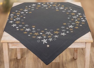 Stickmitteldecke "Sternenhimmel", zum Besticken in Platt-, Spann-, Stiel- und Steppstich. Vorgedrucktes Motiv, randfertig gesäumt, mit 4,5 cm Saum. Komplettpackung: Anleitung, Garn. Stofffarbe: grau. Größe: 85 x 85 cm. Material: Stoff 100 % Polyester, Garn 100 % Baumwolle.