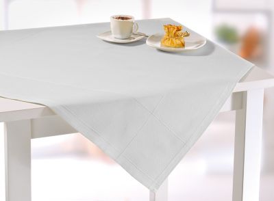 Stickmitteldecke in der Farbe Weiß, mit eingewebter Aidaborte, Aidaborte 11,5 cm breit, komplett gesäumt, zum individuellen Besticken (ca. 4 Stiche/cm). Größe: 90 x 90 cm. Material: 100 % Baumwolle.