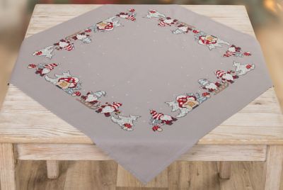 Stickmitteldecke "Wichtel-Zeit", zum Besticken in Kreuz- und Knötchenstich. Vorgedrucktes Motiv, randfertig gesäumt. Komplettpackung: Anleitung, Garn, Sticknadel. Stofffarbe: dunkelgrau. Größe: 72 x 72 cm. Material: Stoff und Garn 100 % Baumwolle.